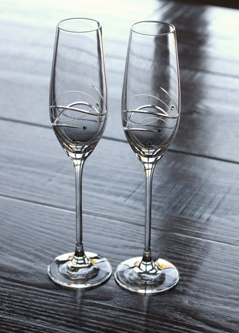 This set of handmade Toasting Flutes will sparkle on your wedding or anniversary table! Featuring the elegant Windswept Pattern, these glasses are embellished with a trio of sparkling green Healy Signature crystals and a deeply carved design encircling each glass.