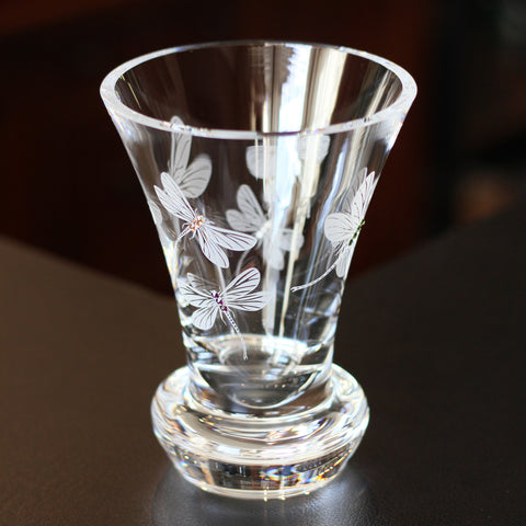 Our Dragonfly pieces are unique; no two are carved exactly the same! This lovely flared vase is hand-carved with a lovely medley of fanciful Healy Glass Artistry Dragonflies that appear to flutter around it. Each is adorned with a sparkling array of multicolored crystals, which reflect the light beautifully.