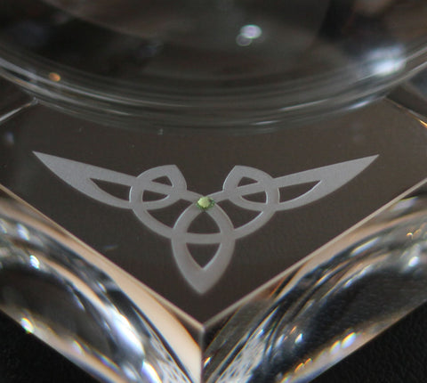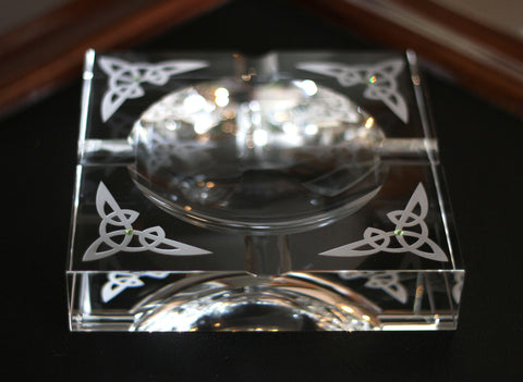 This heavy 7" cigar rest/tray is crafted from solid crystal with stunning clarity and reflective qualities! Each corner is hand-carved with a Trinity Knot and embellished with sparkling green Healy Signature Crystals.