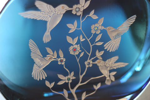 The Healy Glass Artistry Sweet Surprises design features our Hummingbirds amongst an array of sparkling flowers! No two pieces are exactly alike; from the detailed, hand-carved finish to the hand-set multicolored crystals, reflecting the light beautifully.